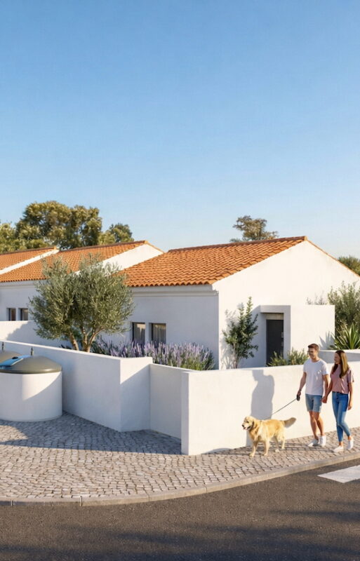 Carrascalinho is Living by CO’s 22-home neighbourhood near Aljezur and Rogil, a turn-key townhouse collection designed for healthy, low-maintenance and comfortable living. Each home is built with a mold-resistant, bio-based construction system and an all-electric setup powered by solar PV and a heat pump.